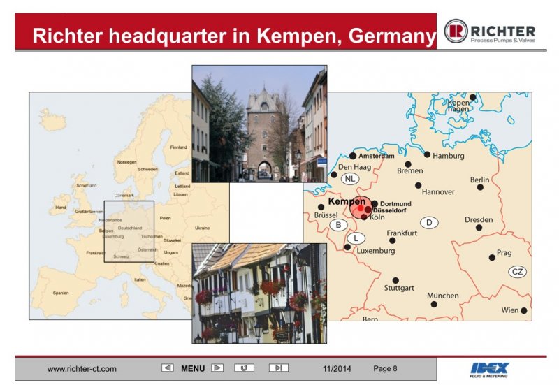 瑞希特于1957年成立于德国杜塞尔多夫Kempen镇,1994年加入美国ITT集团,2008年加入IDEX集团,主要生产衬里的耐腐蚀泵和阀门。